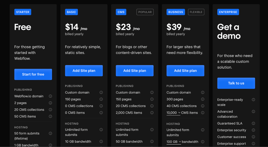 Webflow конструктор сайтів пропонує кілька тарифних планів для різних потреб, включаючи безкоштовний план з обмеженими функціями, а також преміум-плани від 14 дол/міс з розширеними можливостями для бізнесу та інтернет-магазинів.